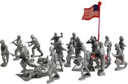 Sadržaj uključuje vojnike u tri boje (srebrna, narančasta, zelena) i četiri zastavice (Njemačka, Ujedinjeno Kraljevstvo, SAD, Japan), što olakšava podjelu jedinica i potiče razvoj mašte. Sve je izrađeno od atestirane plastike i zadovoljava normu EN71.