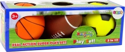 Ovaj set 3-u-1 idealan je za prve sportske doživljaje djece. Loptice su izrađene od mekanog i ugodnog materijala, blagoga za male ručice i ujedno sigurnog za igru u interijeru i eksterijeru. Realistične boje i uzorci pojedinih ekipnih sportova motiviraju djecu na aktivno kretanje i oponašanje omiljenih igara.