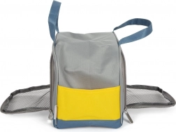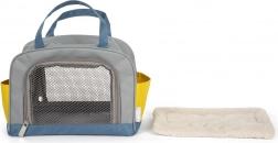 Siva i plava transportna torba s dvostrukim ručkama i žutim džepovima idealno je rješenje za nošenje malih kućnih ljubimaca, osiguravajući udobnost i sigurnost vašeg ljubimca.