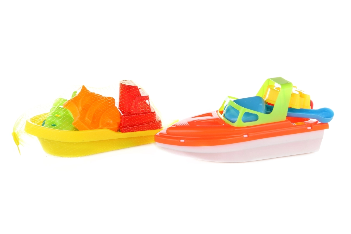 Plastična lađica s igračkama za pijesak. Sadrži grabljice, lopaticu i 2 kalupa. Veličina lađice cca 27 x 10,5 cm (ovisno o vrsti). Dob 3+
