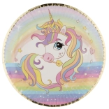 Unesite na stol dozu čarolije s tanjurima s duginim motivom jednoroga. Elegantni zlatni obrub i blago rebrasti rub dodaju vašem postavu stola stil, bilo da priređujete rođendansku zabavu, dječju proslavu ili bajkovitu temu.