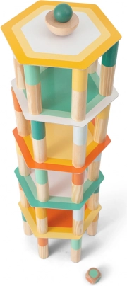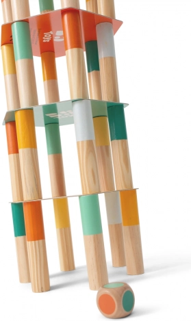 Sagradite visoku kulu od šarenih stupova i platformi, a zatim se naizmjenično pokušajte izvaditi pravi dio prema boji na kocki. Svaki je potez napet – neodgovarajuće odabran stup može uzrokovati pad cijele kule i polukugle smještene na vrhu. Igra je izrađena od kvalitetnog drva i kartona, sigurna je, izdržljiva i odlična za djecu i odrasle.