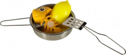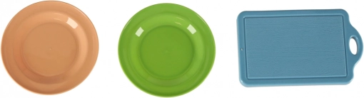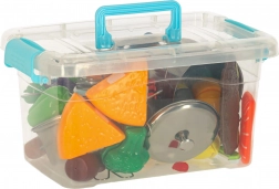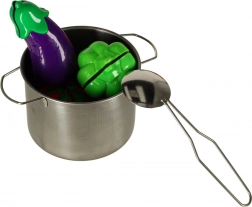 Ovaj svestrani set namirnica i posuđa za djecu nudi realistično kuhanje u dječjoj kuhinji. Pojedini komadi voća i povrća se odvajaju na dijelove i mogu se „rezati“ sigurnim plastičnim nožem na dasci. Metalni lonci, tava, cjedilo i tanjuri daju igri autentičnost.