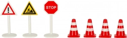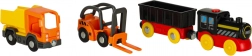 lokomotiva s vagonom, dizalica, viličar, 4 figurice, 6 stabala, 3 prometna znaka, 4 čunja, paleta i teret, kutija za pohranu, dijelovi tračnica