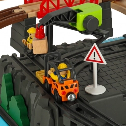 Ova sveobuhvatna drvena željeznička staza donosi djeci fascinantan svijet prometa i gradnje. Od pojedinačnih dijelova složit ćete razvedenu prugu s usponima, po kojoj se samostalno kreće drvena lokomotiva. Tematski elementi gradilišta – dizalica, viličar, čunjevi i znakovi – stvaraju realističnu scenu i pozivaju na otvorenu igru.