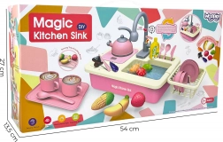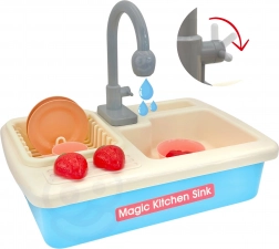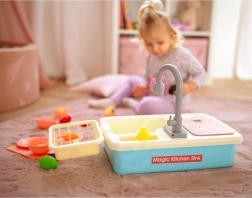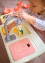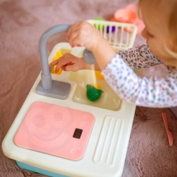 Ugrađena pumpa nakon umetanja 2× AA baterija pokreće vodu u sudoperu. Djeca uživaju u realističnom ispiranju posuđa i sigurnoj igri bez nereda.