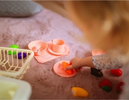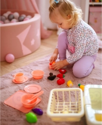 Set sadrži tanjure, zdjelice, šalice, pribor za jelo, čajnik, dasku za rezanje i plastične namirnice na čičak (voće i povrće) za sigurno “rezanje”. Djeca mogu pripremiti meni, poslužiti ga, a zatim oprati posuđe – od igre do odgovornosti samo je jedan korak.