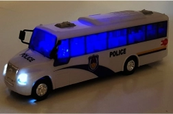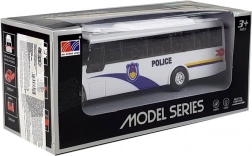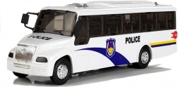 Metalni policijski autobus u bijeloj boji oduševit će realističnim detaljima, svjetlosnim i zvučnim efektima te vožnjom na povlačenje (Pull-Back). Duljina 21 cm, prozirni prozori, retrovizori i srebrne ratkape naglašavaju autentičnost. Napajanje 3× AA (nisu uključene), pogodno od 3 godine.