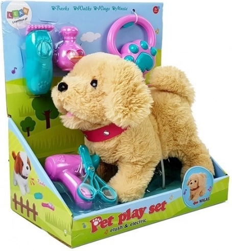Slatki krem plišani psić na povodcu razveselit će svakog malog ljubitelja životinja. Nakon umetanja baterija psić se šeće na povodcu, maše repom i miče glavicom. U kompletu su frizerski dodaci za njegu ljubimca, pa djeca mogu maštati i brinuti se o svom “dlakavcu” bez brige. Sjajan poklon u poklon-ambalaži.