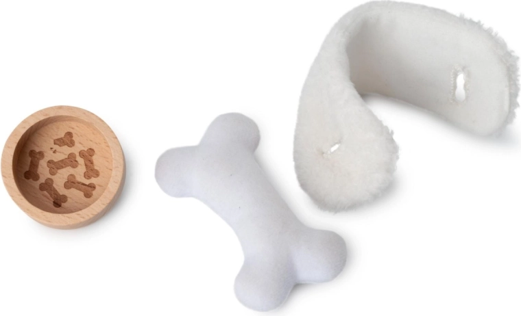 Psić Jules ima svoju košaricu, odjeću, zdjelicu za hranu i kost za igru, što djeci omogućuje razvijanje mnogih vještina: