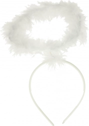 Set sadrži i plastični obruč za kosu s mekim, perjastim materijalom koji čini aureolu.