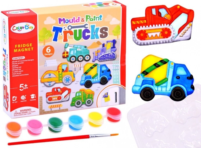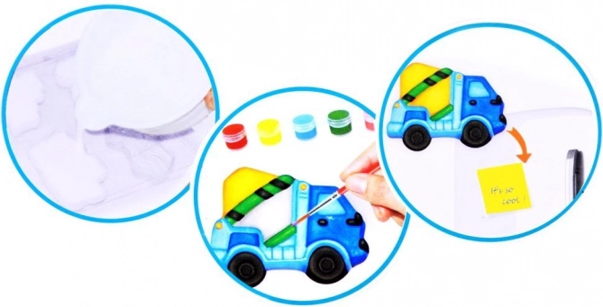 Kreativni set za djecu s kojim će izraditi vlastite magnete za hladnjak u obliku građevinskih vozila. Sadrži sve potrebno za lijevanje, bojanje i magnetiziranje 6 različitih motiva – zabavna i poticajna aktivnost za male umjetnike.