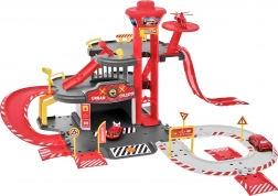 Set s garažom uključuje 2 autića i helikopter.
