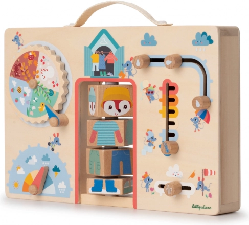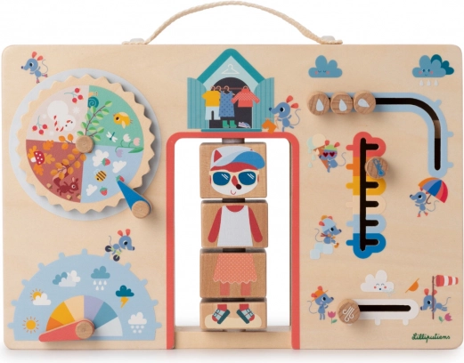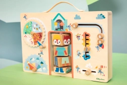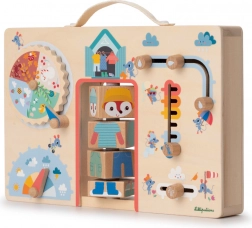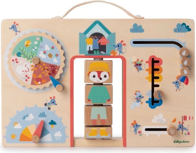 Interaktivni drveni panel s lisicom Alice uči djecu razumjeti pojam vremena i pravilno odijevanje. Podupire finu motoriku, logičko razmišljanje i samostalnost. Okretni drveni blokovi omogućuju odabir odjeće za sunce, vjetar i zimu. Izrađen od drveta s FSC certifikatom, lako se održava i prikladan je od 12 mjeseci.