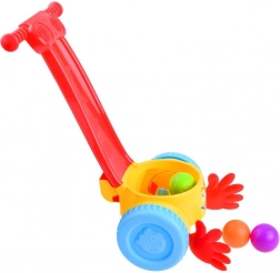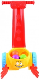 Žuta baza, crvena ručka i elementi, plavi kotači, šarene loptice
