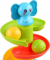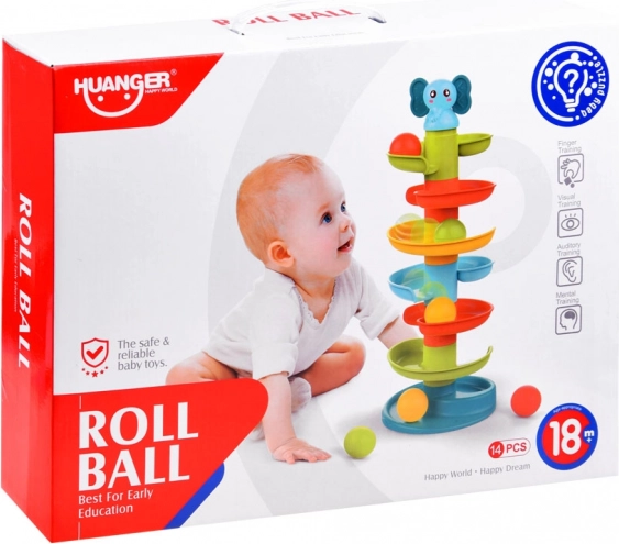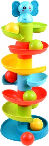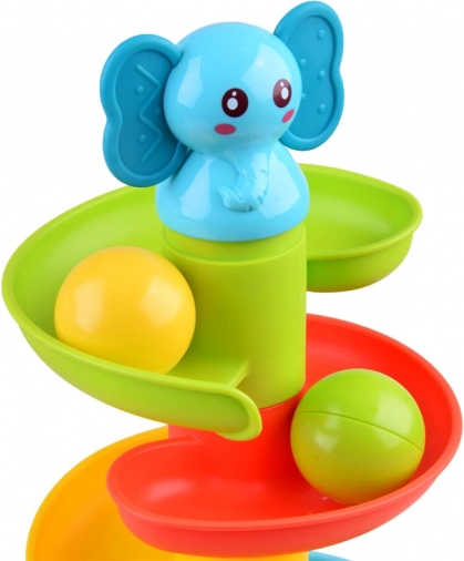 Ova šarena spiralna staza s kuglicama sa simpatičnim slonićem na vrhu odmah će zaokupiti pažnju djece. Šest šarenih platformi stvara glatku stazu niz koju se kuglice živo kotrljaju i pritom ugodno zveckaju. Slonić ima mekano gumeno uško prikladno kao nježna grickalica za izbijajuće zubiće.