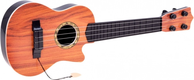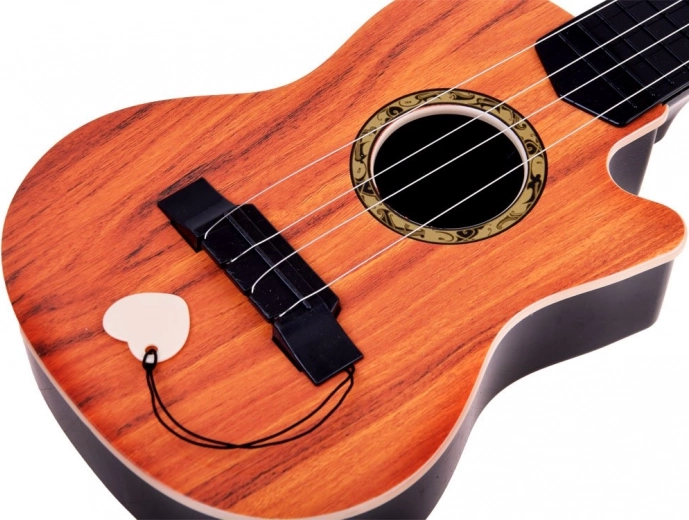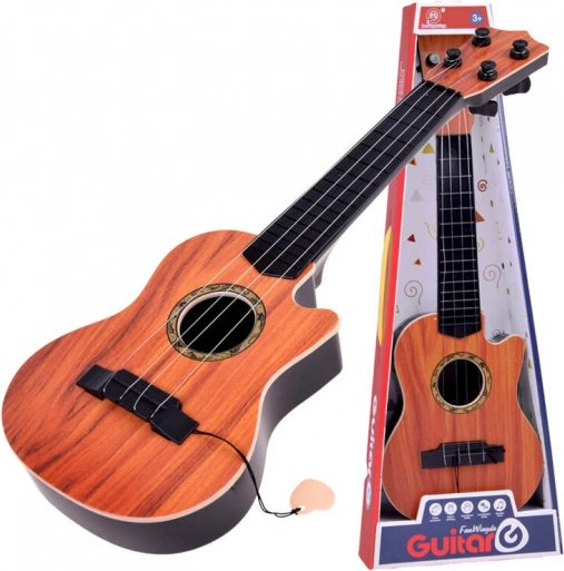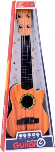 Lagana dječja gitara s imitacijom drva i četiri metalne žice idealna je za prve glazbene korake. Zahvaljujući kompaktnim dimenzijama djeci dobro leži u ruci i na njoj se lako svira. U kompletu je trzalica te mogućnost osnovnog dotezanja na vratu za bolji zvuk. Potiče razvoj ritma, motorike i kreativnosti. Izvrstan izbor za male glazbenike i prvi susret sa svijetom glazbe.