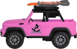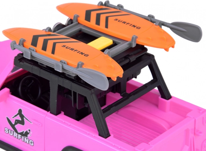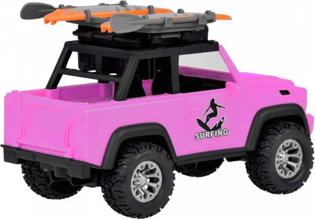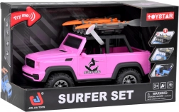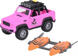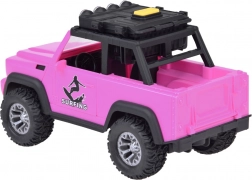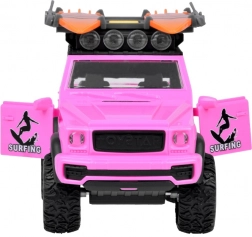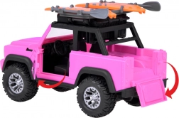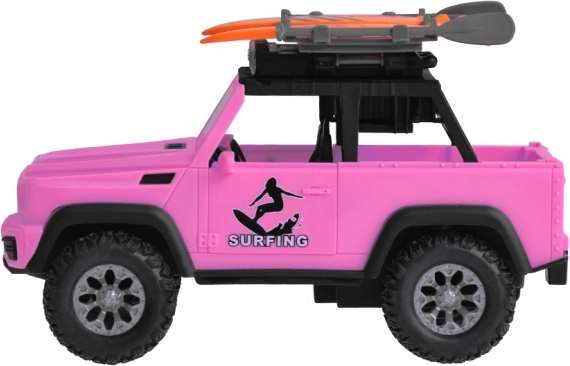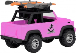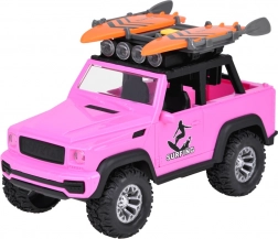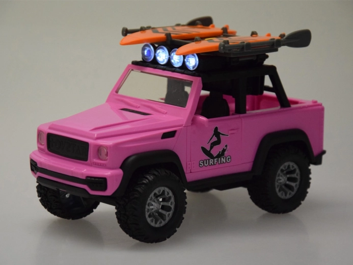 Stilski ružičasti terenski automobil za male avanturiste donosi svjetlosne i zvučne efekte, otvarajuća vrata, preklopni poklopac prtljažnika i velike gumene kotače s izraženim profilom. Na krovu se nalazi nosač s dvije daske za surfanje i svjetlosni panel za još realističniju igru.