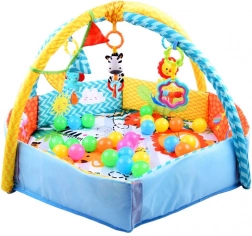 Mekana podloga s šarenim ilustracijama i visećim igračkama pruža djeci sigurno i zabavno okruženje.