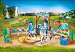 Uđite u svijet jahačkih avantura s Igralištem za konje Playmobil. Sadrži robusne elemente za igru, uključujući pokretnu bazu, dvije Playmobil figurice, konja i raznoliku jahaću opremu.