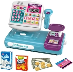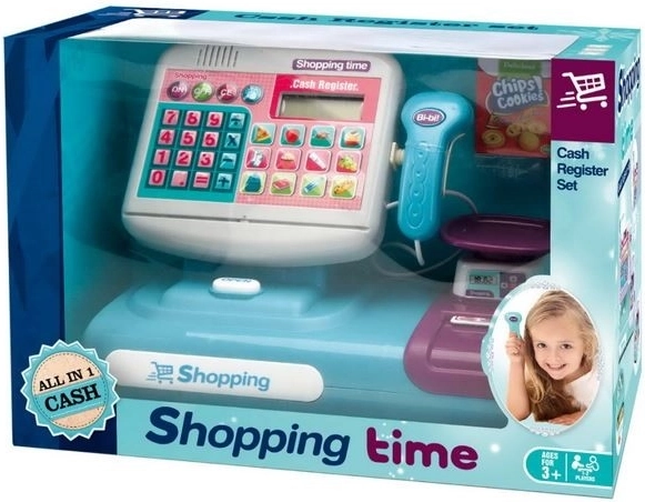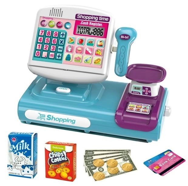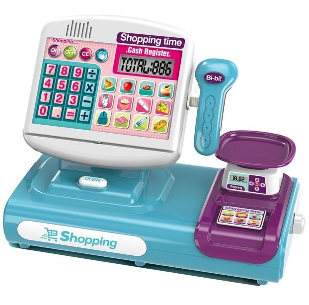 Ova elektronička blagajna nudi realističan doživljaj kupovine: dodirna tipkovnica s mnogo tipki, LCD zaslon, čitač platnih kartica, funkcionalna vaga i skener koji emitira svjetlosne i zvučne efekte. Blagajna govori engleski, a pritiskom na gumb otvara se ladica za gotovinu.