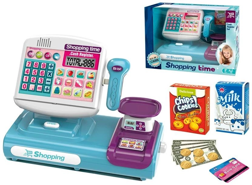 U kompletu su platna kartica, novčanice, kovanice, vaga i ladica koja se otvara. Sve što djeci treba za potpunu igru.