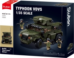 Sluban Typhoon je kvalitetna građevna set-stavebnica za sve ljubitelje vojne tehnike i akcijske igre. Model u mjerilu 1:35 ističe se realističnim detaljima poput okretne kupole, otvarajućih dijelova i autentičnih dodataka za figurice. Set je izrađen od izdržljive i neškodljive ABS plastike, a priložene su i jasne upute.