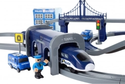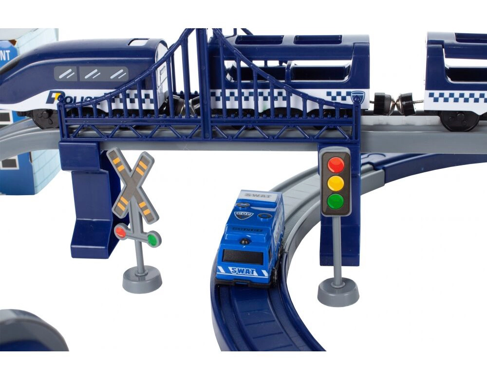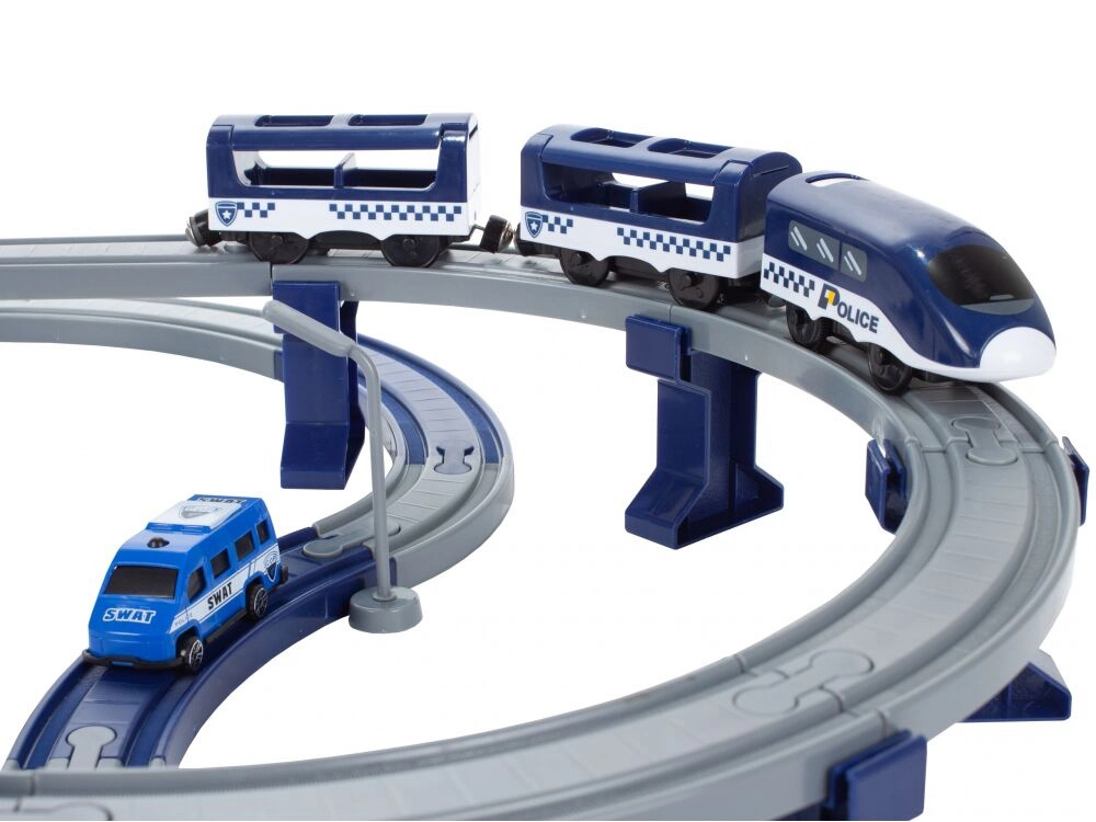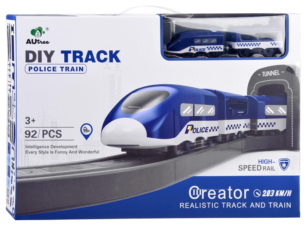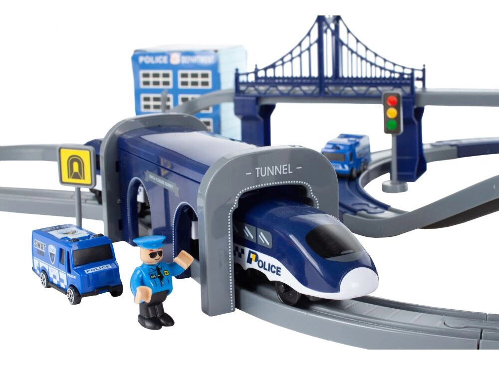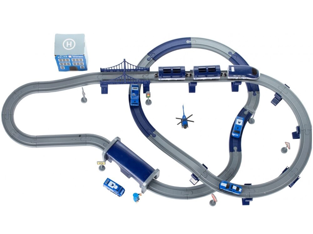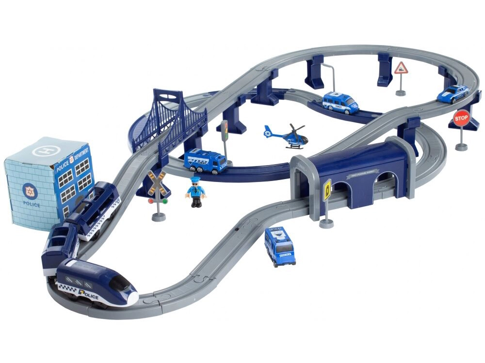 Bogato opremljen set koji se sastoji od 92 elementa omogućuje vam izgradnju željezničke rute s mostovima, vijaduktima i tunelima. Uz trasu se mogu postaviti prometni znakovi te policijska postaja s heliodromom.
