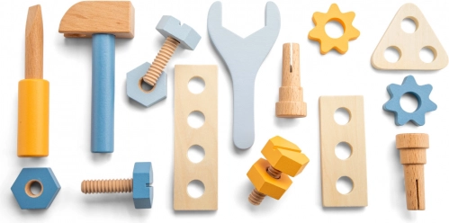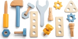 Dio seta je 16 funkcionalnih dijelova: čekić, odvijač, ključ, čavli, vijci i zupčanici za beskrajne varijante igre. Proizvod je od FSC certificiranog drva, pa podržava održiv izbor za roditelje i planet.