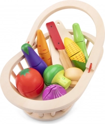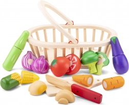 Drveni set za rezanje povrća s košaricom idealan je za prve kuharske pokušaje. Zahvaljujući čičku djeca mogu povrće sigurno “rezati” i ponovno spajati, čime vježbaju koordinaciju oko–ruka i razvijaju maštu u igri kuhanja.