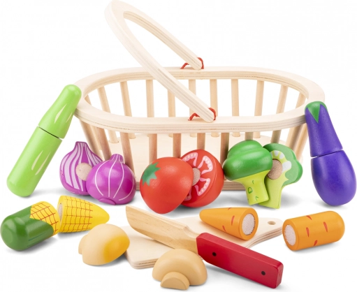 Set sadrži košaricu za lako spremanje i prenošenje, dasku i drveni nož. Šareni komadi povrća – rajčica, mrkva, brokula, patlidžan, luk, kukuruz, gljive i krastavac – potiču na istraživanje i učenje o zdravoj prehrani.