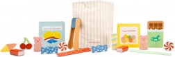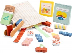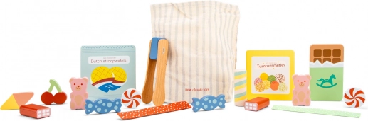 Ovaj drveni set slatkiša oduševit će sve male ljubitelje igre trgovine ili kavane. U njemu ćete pronaći raznolik izbor drvenih slatkiša – od čokoladice do gumenih medvjedića – pažljivo izrađenih tako da izgledaju poput pravih. Dio seta je i praktična pamučna torba za spremanje te drvene hvataljke za zabavno posluživanje.