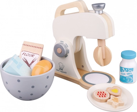 Ovaj prekrasan drveni set sadrži realistični samostojeći mikser s okretnom metlicom, drvenu zdjelu i bogat pribor: brašno, šećer, vrč mlijeka, dvije polovice jaja i tanjur s tri keksa. Djeca mogu oponašati pečenje i pripremu slastica kao pravi pekari.