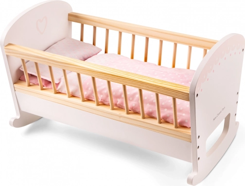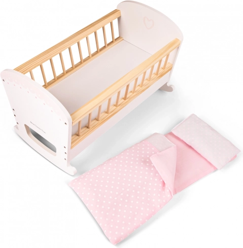 Ova drvena kolijevka stvara idealan prostor za igru brižnog roditelja. Zahvaljujući priloženim madracu, poplunu i jastučiću lutke će uvijek biti u udobnosti i toplini, dok nježno ljuljanje pomaže pri „uspavljivanju” omiljenih igračaka. Elegantna kombinacija prirodnog drva i bijele boje uklopit će se u svaku dječju sobu.