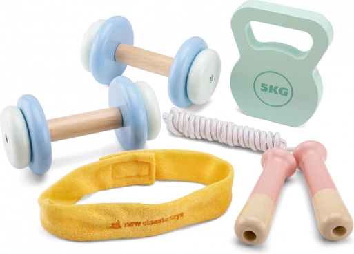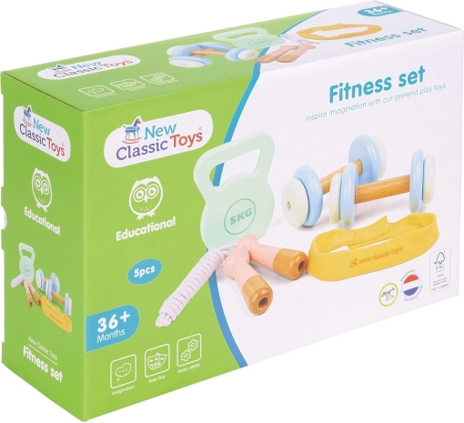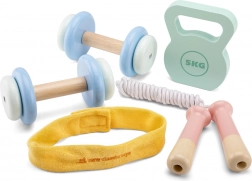 Upoznajte svijet vježbanja s veselom drvenom fitness setom za djecu od 3 godine! Ovaj set sadrži sve potrebno za zdravu igru i stvaranje navika: bučice, girju (kettlebell), uže za preskakanje i znojnik za glavu.