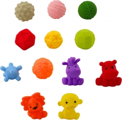 Set uključuje različite oblike, životinje i šarene teksture koje potiču osjetilni razvoj kod djece.