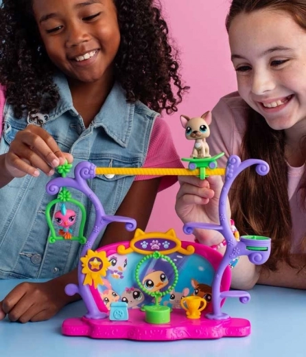 Ružičasto‑ljubičasta pozornica s visećim kukicama, ogledalom i ukrasima stvara idealno okruženje za kreativne priče i nastupe vaših LPS ljubimaca.