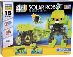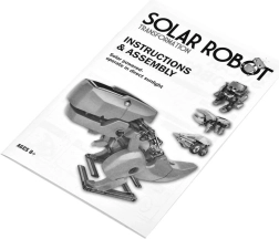 Uključeni elementi: plastični dijelovi za sastavljanje robota, solarni panel, motor, plastične oči, naljepnice i slikovni vodič.