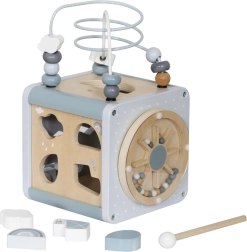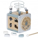 Drvena edukativna kocka nudi mnogo atrakcija koje će zasigurno zainteresirati i oduševiti vaše dijete. Svaki je element pažljivo dizajniran kako bi savršeno pristajao malim ručicama vašeg istraživača. Čvrsta drvena konstrukcija jamči izdržljivost, a nježna pastelna grafika potiče maštu i razvija koncentraciju. Pomicanje, pritiskanje i manipulacija pokretnim dijelovima potiču razvoj manuelnih vještina te istodobno osiguravaju zabavnu i poticajnu igru.