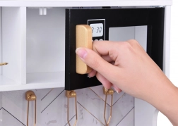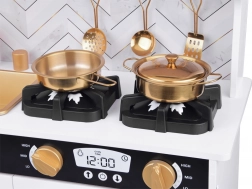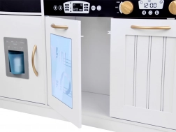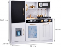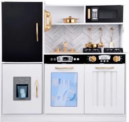 Probudi dječji interes za kuhanje ovom drvenom kuhinjicom izrađenom s naglaskom na detalje. Kuhinjica ima pretežno bijeli dizajn s crnim i zlatnim detaljima koji joj daju eleganciju. Djeca mogu pisati kredom na ploči postavljenoj na hladnjaku, oponašati pečenje u pećnici i pripremati hranu uz realistične zvučne i svjetlosne efekte.
