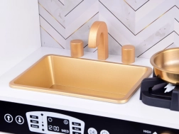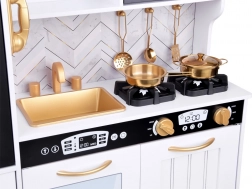 Kombinacija bijelih, crnih i zlatnih elemenata daje kuhinjici moderan i stilski izgled koji će razveseliti svako dijete.