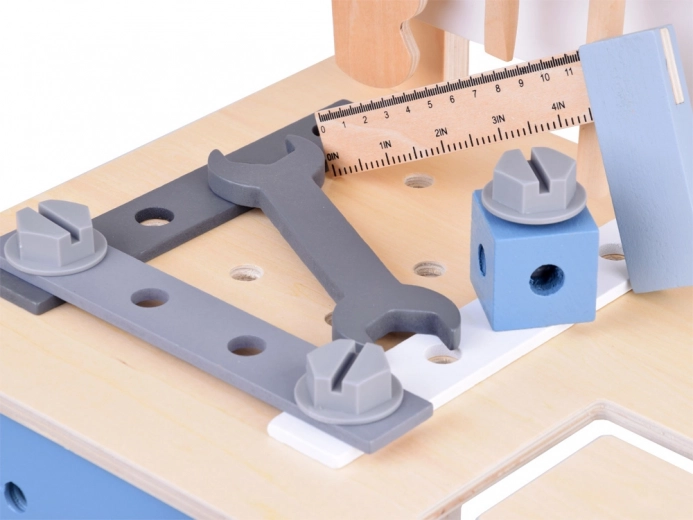 Ova drvena radna klupa za djecu osmišljena je za razvoj spretnosti, koordinacije i logičkog razmišljanja. Raznoliki set pribora – od vijaka, matica i spojnih letvica do zupčanika, ravnala, škripca, čekića i odvijača – omogućuje djeci zavrtanje, mjerenje, pričvršćivanje i eksperimentiranje s prijenosima.