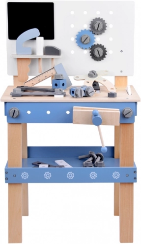 Otkrijte kvalitetnu drvenu radnu klupu za male majstore koja potiče finu motoriku, kreativnost i učenje kroz igru. Stabilna konstrukcija od punog drva, sigurno zaobljeni rubovi i bogata oprema alata u prirodnim, plavim i sivim tonovima osiguravaju sate smislene zabave i konstruktivnog slaganja.
