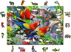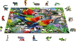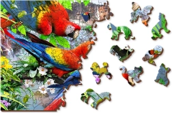 Drvene puzzle Otok papiga od WOODEN CITY donose upečatljivo slaganje s prekrasnom scenom tropskih papiga među zelenilom i slapom. Dijelovi od čvrste HDF ploče (3–4 mm) glatki su, izdržljivi i zahvaljujući laseru precizno izrezani. Dio elemenata ima posebne siluete životinja, građevina ili predmeta – neke od njih možete uspraviti kao male figurice.