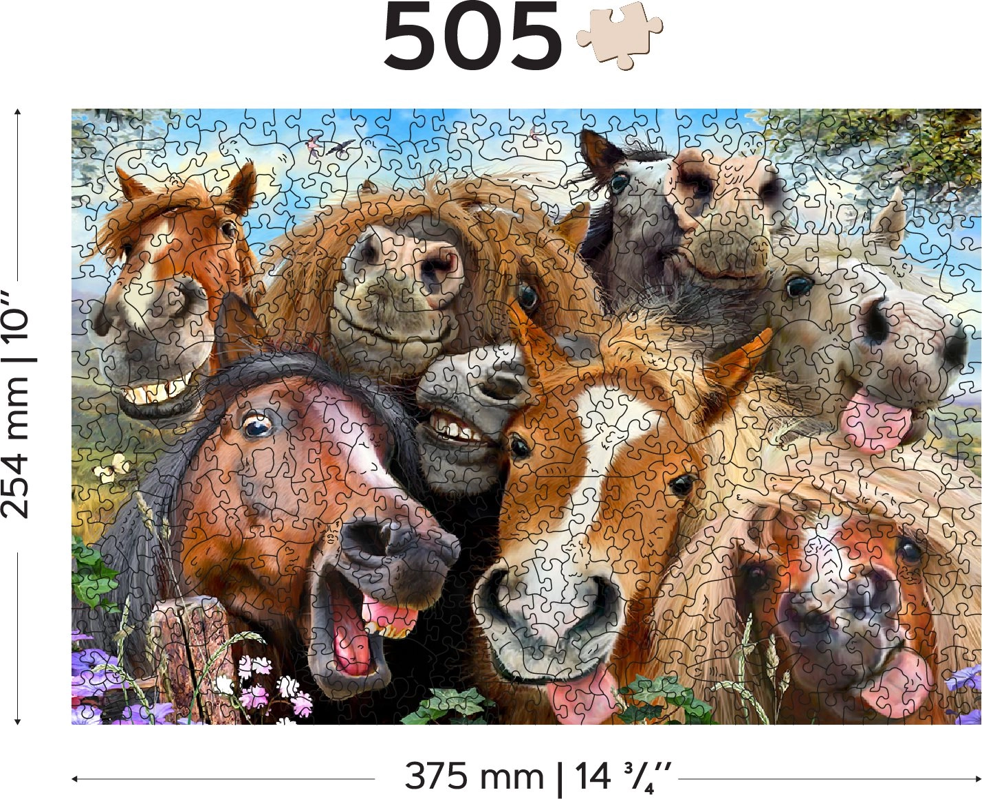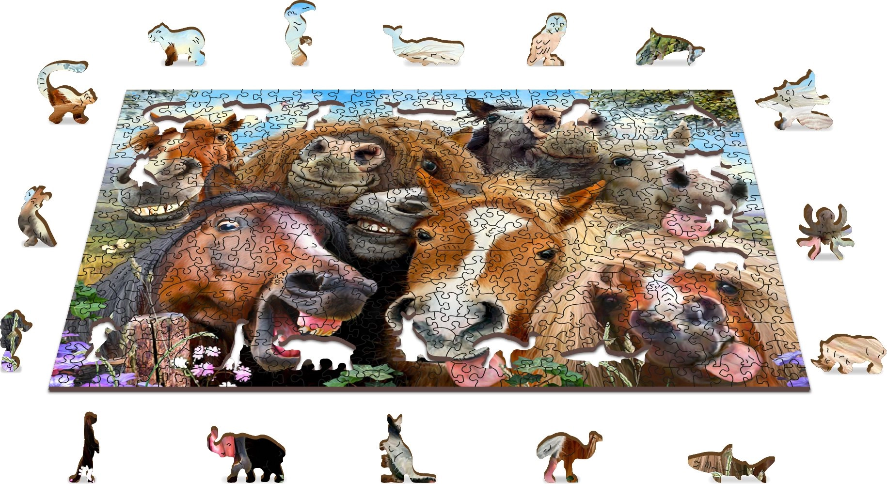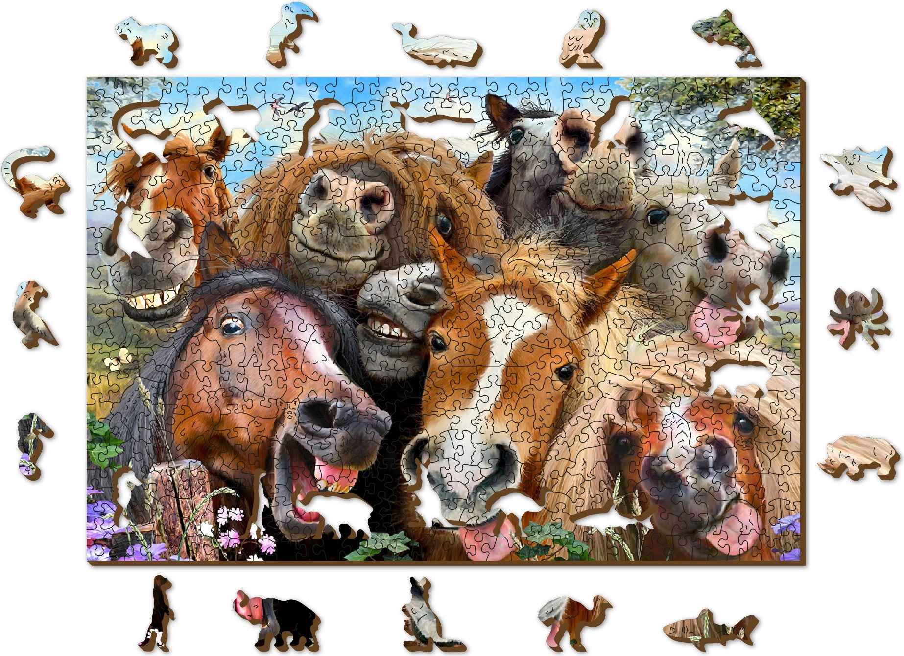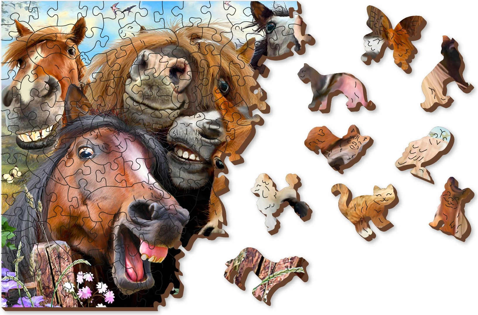 Stilske drvene puzzle WOODEN CITY „Konji svuda oko“ nude originalnu izradu s precizno laserski naglašenim detaljima. Dio dijelova ima oblike životinja, građevina i predmeta te mogu samostalno stajati kao male figurice. Zahvaljujući raznolikim oblicima slaganje pruža ugodan izazov i iskusnijim ljubiteljima puzzli.