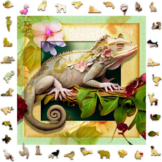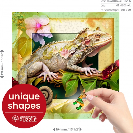 Otkrijte zabavu i izazov u jednom s drvenim puzzlama WOODEN CITY „Kameleon i cvijeće” od 505 dijelova. Zahvaljujući laserski izrezanim, posebno oblikovanim komadićima i dvostranom izvedbom, nude višu razinu težine, jedinstvene oblike i ekološko pakiranje bez plastike.