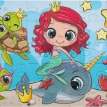 Prekrasne dječje puzzle s motivom morske vile i životinja iz podmorskog svijeta. Sadrži 30 velikih dijelova za lako slaganje, a konačna slika ima dimenzije 29 × 18 cm. Idealno kao prve puzzle za djecu, isporučuje se u poklon-kutiji s ručkom za udobno prenošenje.
