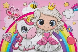 Ova bajkovita slagalica s princezom i jednorogom idealna je za prvo slaganje. Veliki, lako prihvatljivi dijelovi potiču finu motoriku, strpljenje i logičko razmišljanje djece. Nakon slaganja dobit ćete prekrasnu sliku koju će djeca obožavati.