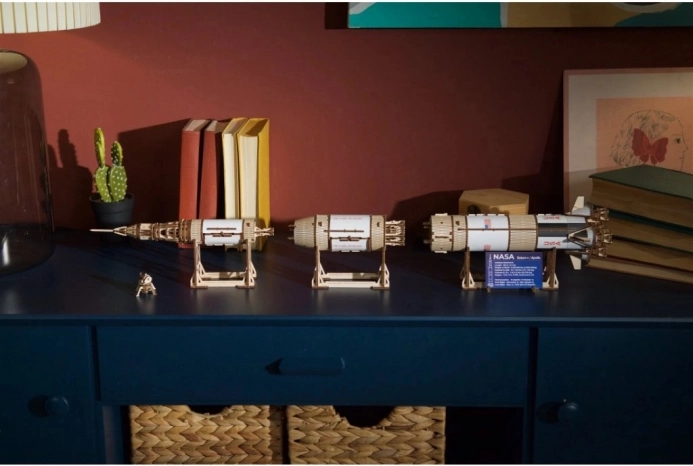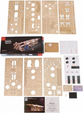 Model je izrađen od kvalitetnog, ekološkog drva s precizno unaprijed izrezanim dijelovima za sastavljanje bez ljepila. Zahvaljujući detaljnim uputama, mogu ga savladati i spretni početnici, dok će iskusni modelari cijeniti tehničku promišljenost, mehaničke elemente i razrađene detalje, uključujući lunarni modul.