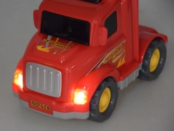 Ovaj veliki dječji tegljač s prikolicom idealan je za male vozače i pilote. Zahvaljujući frikcijskom pogonu dovoljno je igračku pogurnuti po glatkoj podlozi i krenut će. Na krovu kabine nalazi se gumb koji aktivira realistične zvukove motora i trube te svjetlosne efekte, pa je igra još zabavnija.